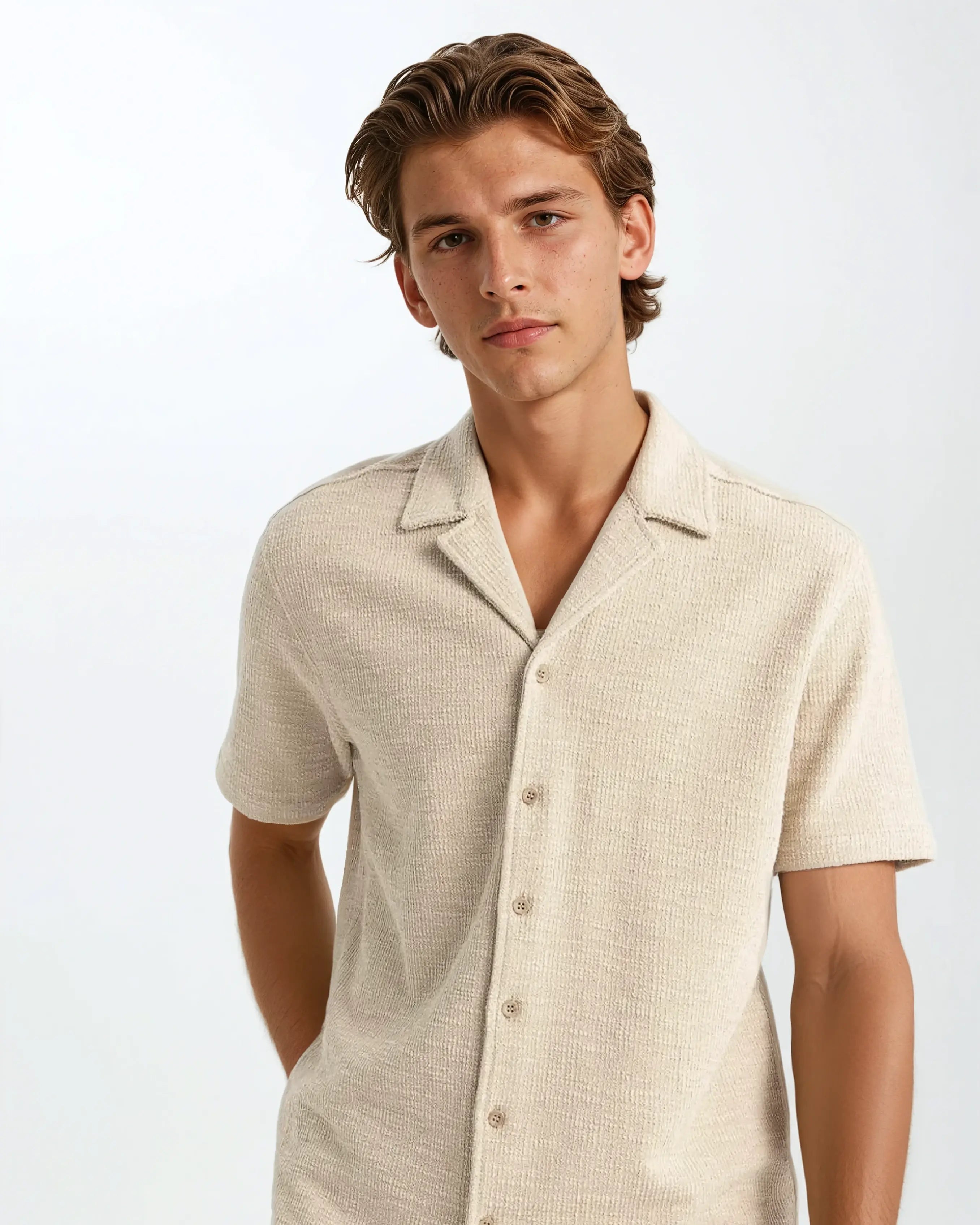 The Beige Waffle Shirt from Oliver Clo is a short-sleeve shirt made from waffle-textured fabric. This shirt is easy to wear and works well in relaxed settings.